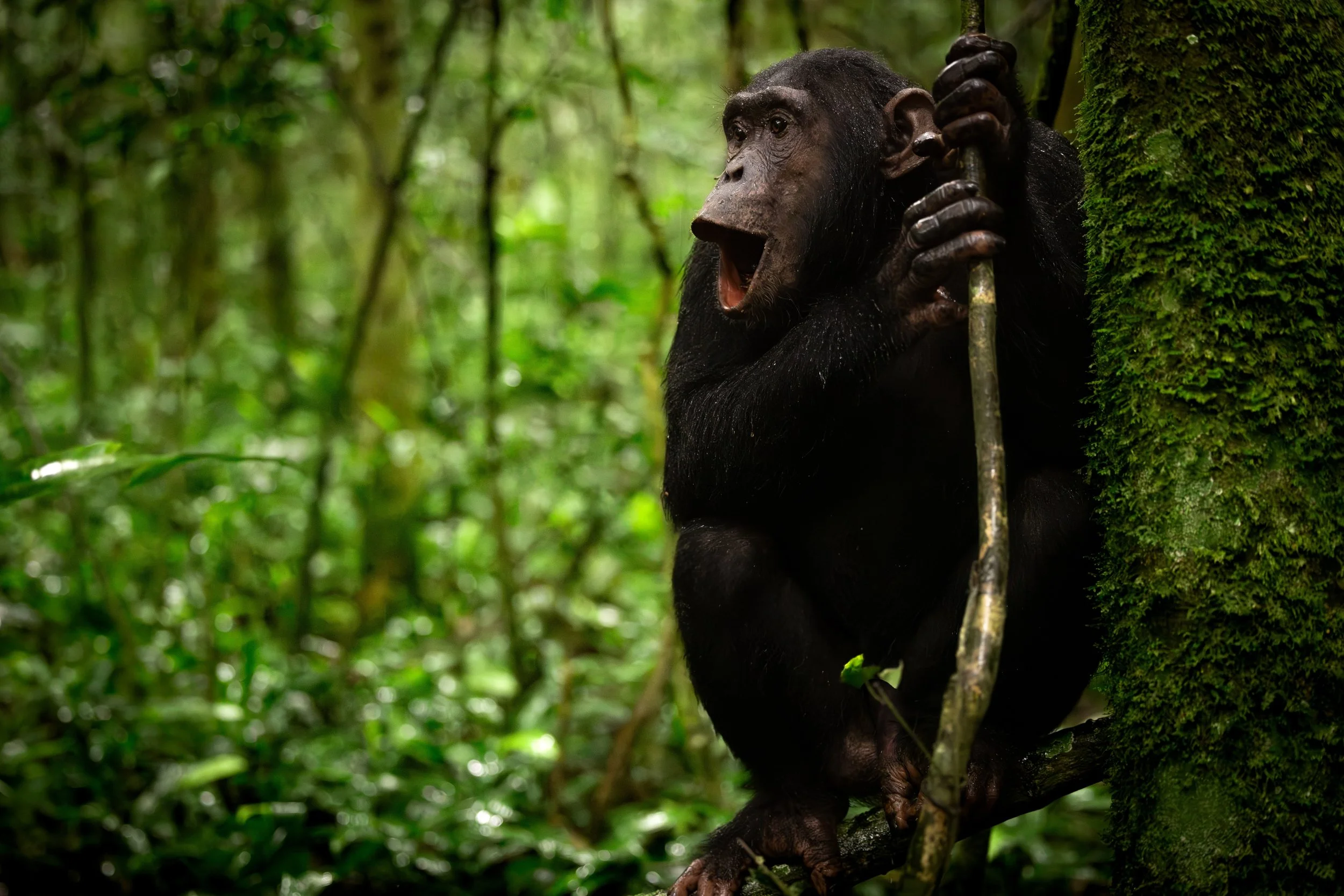 Chimpanzees ran across the forest floor, crashed through branches overhead, shook saplings violently, and slammed limbs against the ground in raw displays of strength. They screamed, chased, and leapt, sometimes brushing past our legs as if we weren’t even there.
