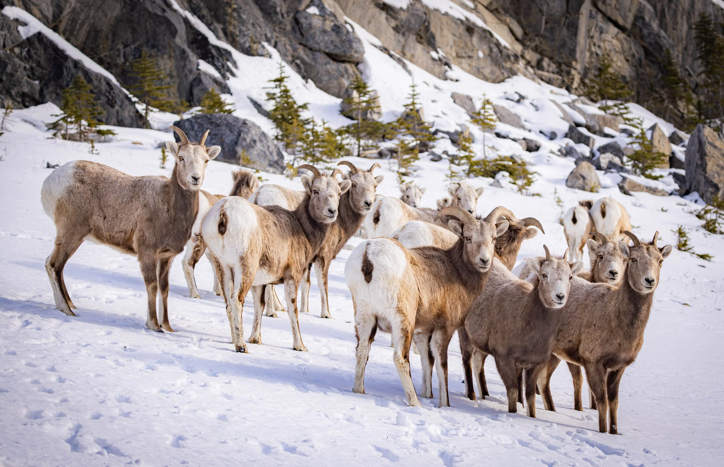 Despite the cold, many animals remain active throughout winter. Elk gather in valley bottoms where snow is shallower and forage more accessible. Bighorn sheep cling to steep, windswept slopes, using terrain that sheds snow and offers escape from predators.